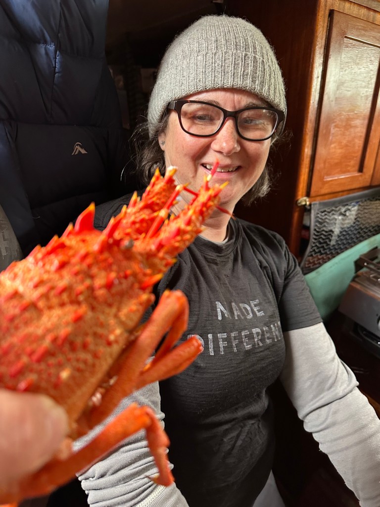 The next day we took the dinghy to shore for a walk around. We were keen to find a way to replenish water and diesel if possible, and to find somewhere to do some washing and have a shower. On the big commercial jetty that the tourist operators use we were lucky to ask a local fisherman if we could come alongside to use the hose. The fisherman, Gavin, turned out to be a real legend who couldn’t do enough to help us. Before we left we had solutions for water and fuel, and he had told us some good fishing spots as well as loaning us a craypot, which came complete with two crayfish! He also offered us use of a brand new mooring he had had put in. Gavin steadfastly refused any payment, even the standard NZ ‘thank you’ of a box of beer, or block of chocolate. Later he gave us several blue cod fillets. A genuinely generous and salt of the earth Kiwi, Gavin just wanted us to enjoy his corner of paradise.