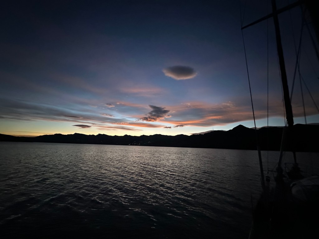 The weather was flukey in the morning, with sails up, sails down, sails up, and eventually two reefs in the sails (reefs are a way of reducing sail canvas so that the boat doesn’t get overpowered in stronger winds). The route from Lyttleton to Port Underwood requires sailing up half of the east coast of the South Island, with nowhere really to stop along the way. Kaikoura is about halfway, but a recent earthquake lifted the seashore and made charts unreliable, and there had been many reports of trees and debris floating miles out to sea in the area after the various storms. We decided to stay well away and do the trip of about 160NM in one go, which would take us about 36 hours.