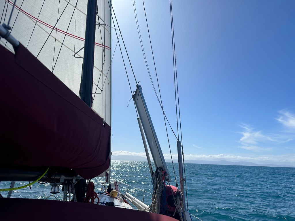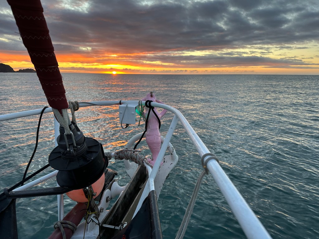 The day passed pleasantly with easy sailing, and the fair winds continued on into the night. One memorable incident occurred when a fishing boat, not on AIS but whose lights I had spotted, called us up on VHF. He warned us that we were approaching two fishing lines that he had set and rattled off four lat and long references to tell us where the lines were. This was a lot of information to take onboard at 3am, and not knowing how much time I had I woke Cara who was quickly able to plot the positions whilst I reduced sail to slow down. It turned out we had plenty of room and time, and were going to pass well to the west of the lines. Still, it was good practice to have to plot a lat and long co-ordinate on our electronic chart, something I was unsure of how to do.