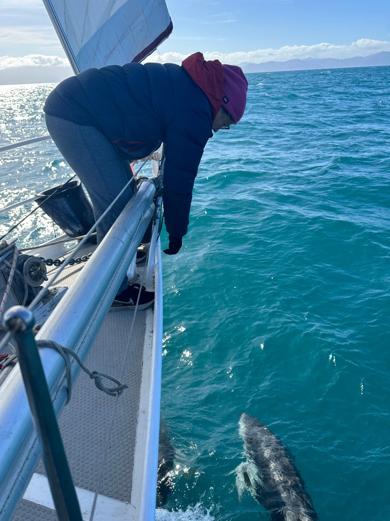 As we rounded Cape Campbell we began to see more sea-life, being joined by different species of dolphins (Hectors and Bottlenose) who rode along with us on our bow wave. Later we managed to catch a fish, a nice kahawai, which was to make a delicious supper.