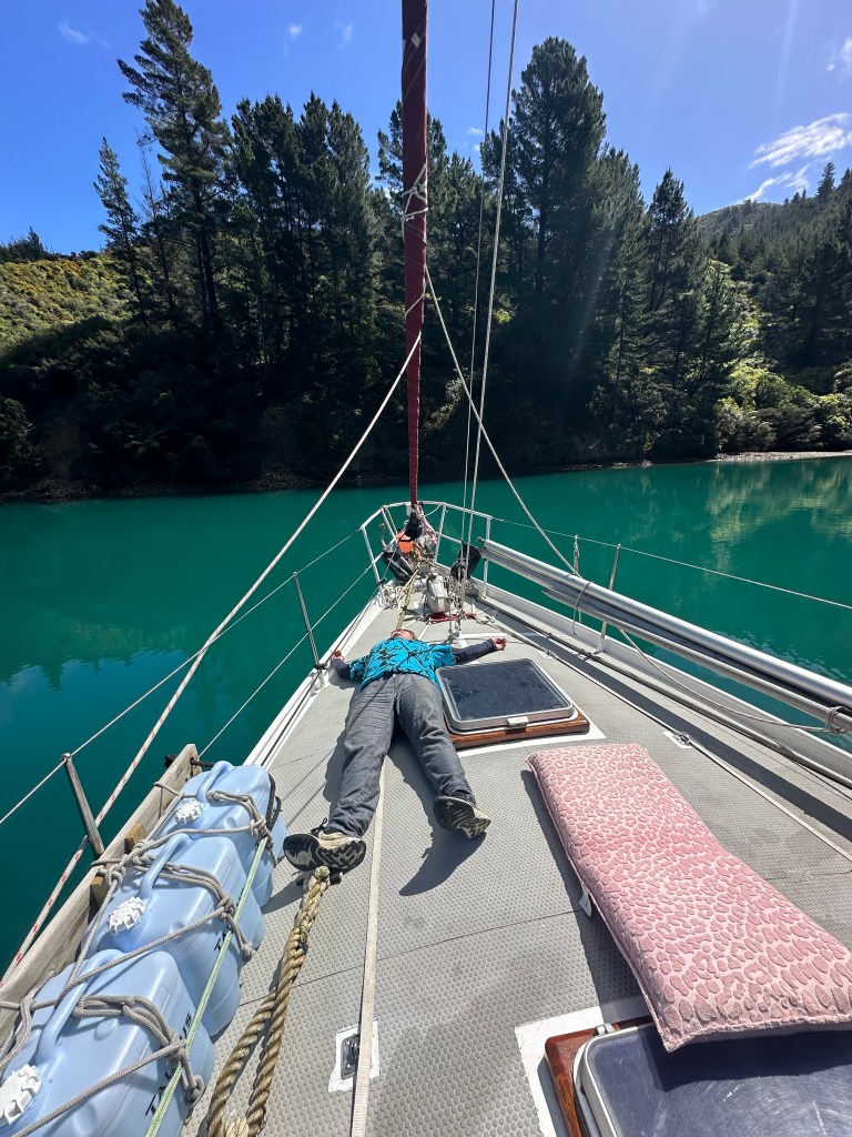 We decided to stop in Ngaruru Bay, where a local club that we had joined had a mooring. There are three clubs with a presence in the Marlborough Sounds who join together to offer their members a great number of moorings throughout the area. To show that the boat is a member of one of these clubs the crew is required to fly two small flags, known as burgees, one for the club, and one showing the year of membership. We had joined Pelorus, the cheapest, and so flew a flag showing a white dolphin on a black background. After a pretty long trip we were glad for the chance to stop and collect ourselves, and sit in the sun for a while.