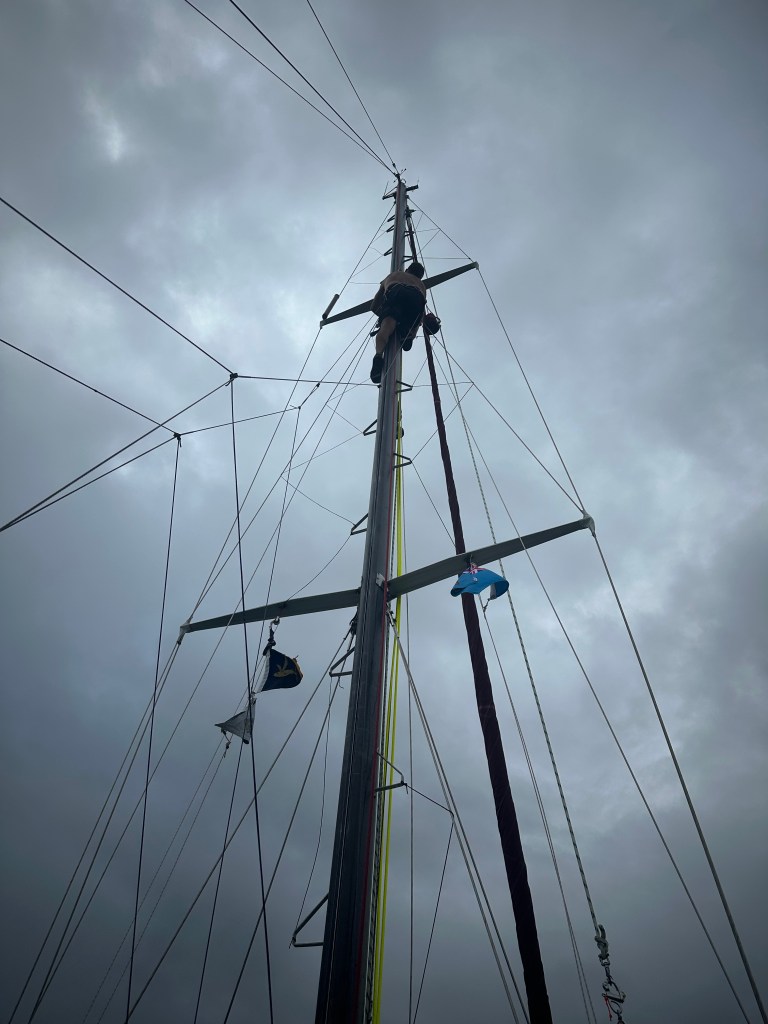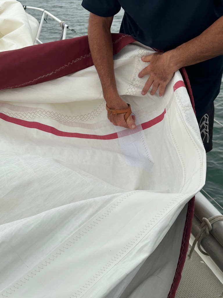 The damage to the sail was near a previous tear, so we suspected that perhaps there was something sharp catching the sail as it dragged past the mast, such as a split pin. I climbed the mast to find an unpleasant surprise…