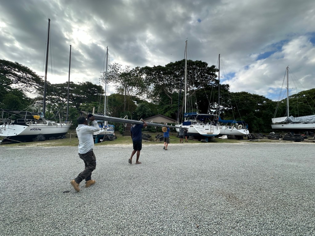 Having asked Sam to take the mast off the boat we thought we had better let him know what our plans were. Happily, it turned out that Sam had arrived back in Fiji the day before and was able to come and assist. Only having third party insurance focuses the mind on what can go wrong, so it was nice to have someone else, with their own insurance, turn up to take charge.