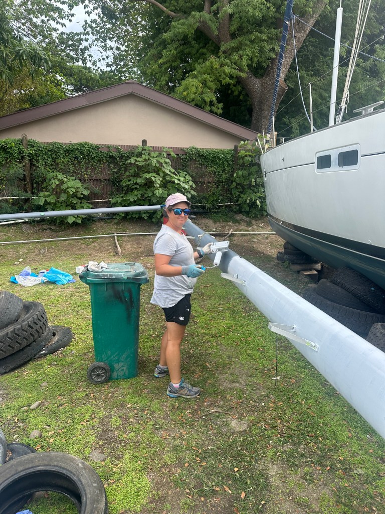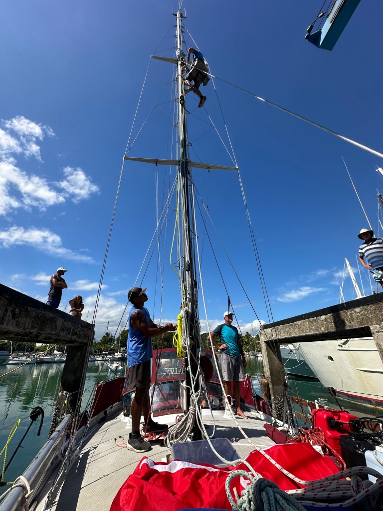 In the above picture Cara is laying the first coat of two-pot polyurethane, the dark grey coat she is painting over is etch primer. All up we gave the mast and boom three coats of the polyurethane light grey. The lines and wiring were then replaced with new, new lights, new VHF aerial, and all the jobs one does when the mast is down and access is available. Finding all the bits and pieces required was a mission, with things like coax cable (for the VHF radio) available, but the connectors that join the cable to the aerial at one end and the radio at the other couldn’t be found for love nor money. We had some spares, but only for the thick cable that wasn’t available in Fiji. Luckily we were able to beg, borrow, and buy the right size from other cruisers. Replacing the mast on the boat went without a hitch and by the end of day the riggers job was done. We had plenty more to do, replacing all the bits and pieces that we had previously taken off: boom, sails, radar mount, radar, and so on and so forth.