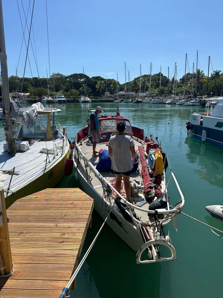 Next day we headed into Vuda Marina (pronounced Vunda) where we had arranged to meet the local rigger, Sam. Eugeni, the solo-sailor we had originally met in Tonga, was on a mooring in Denaru and offered to show us the way and give us a hand. The entrance to Vuda is both narrow and shallow, which equates to a nervous passage. Having someone on hand who knows where to go and how the marina ties its boats up is mighty reassuring and helpful in these situations.