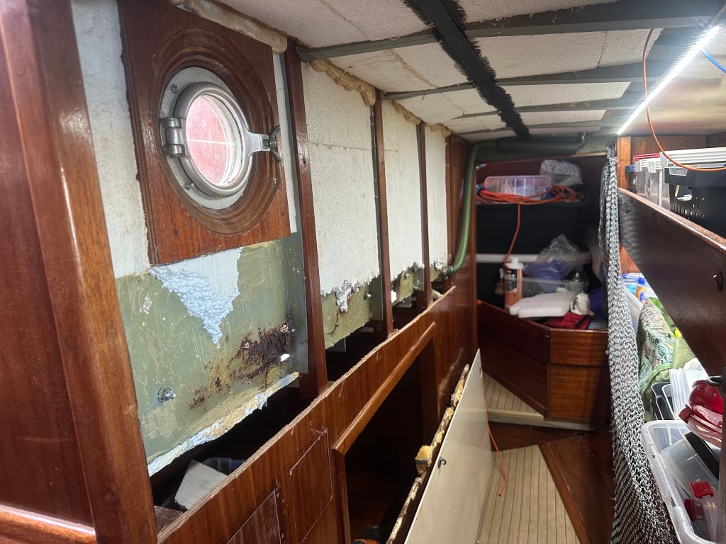 One of the jobs on my list was to clean up some surface rust in the bottom of the cockpit. Unfortunately, when I started cleaning the area up it soon became obvious that the rust was much worse than it appeared. As this area can catch waves it has to be waterproof, so the corrosion had to be repaired. The problem was how best to do it. The biggest difficulty was simply gaining access to the job. On the inside of the boat the corrosion was hidden behind wood panelling that had been epoxied in to place, the boat builders clearly hadn’t considered anyone ever having to take things apart.