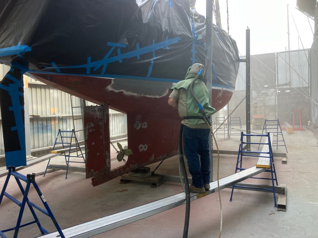Happily, the sandblasters were very complimentary about the state of Taurus’ hull. Not only was there no damage, but they couldn’t believe that she was a 44 year old boat that had been round the world. The professional opinion was that the issue had indeed been one of paint application. So, hopefully, fingers crossed, the paint will stay on this time!