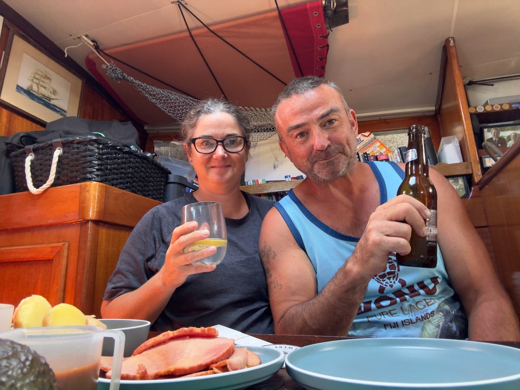 Dinner was roast pork with plenty of crackling, and by God it was good. The wine in the sachets on the table was gifted to us by Viki, the owner of the Pacific Island Rally. Greenskin, the wine company, had sent Viki some samples for cruisers to try. As well as being very palatable wine, the packets of 750ml each are much easier than bottles to store and can be returned to the company to be recycled once empty. So we now have white wine, red wine, and green wine! Thanks to Julian, Viki, and Greenskin, and can we make it a regular thing?
