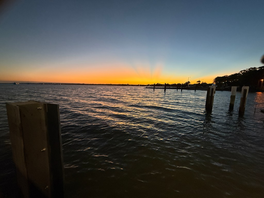 After a short sail of a few hours we reached Coochiemudlo, and dropped anchor a little way from the beach and moored boats. Steve and Karen who had been anchored in Moreton Bay sailed down to join us, and on hearing this Julian extended his dinner invitation to include them. We took our dinghies to the ferry terminal and headed to Victoria Point where Julian picked us up.