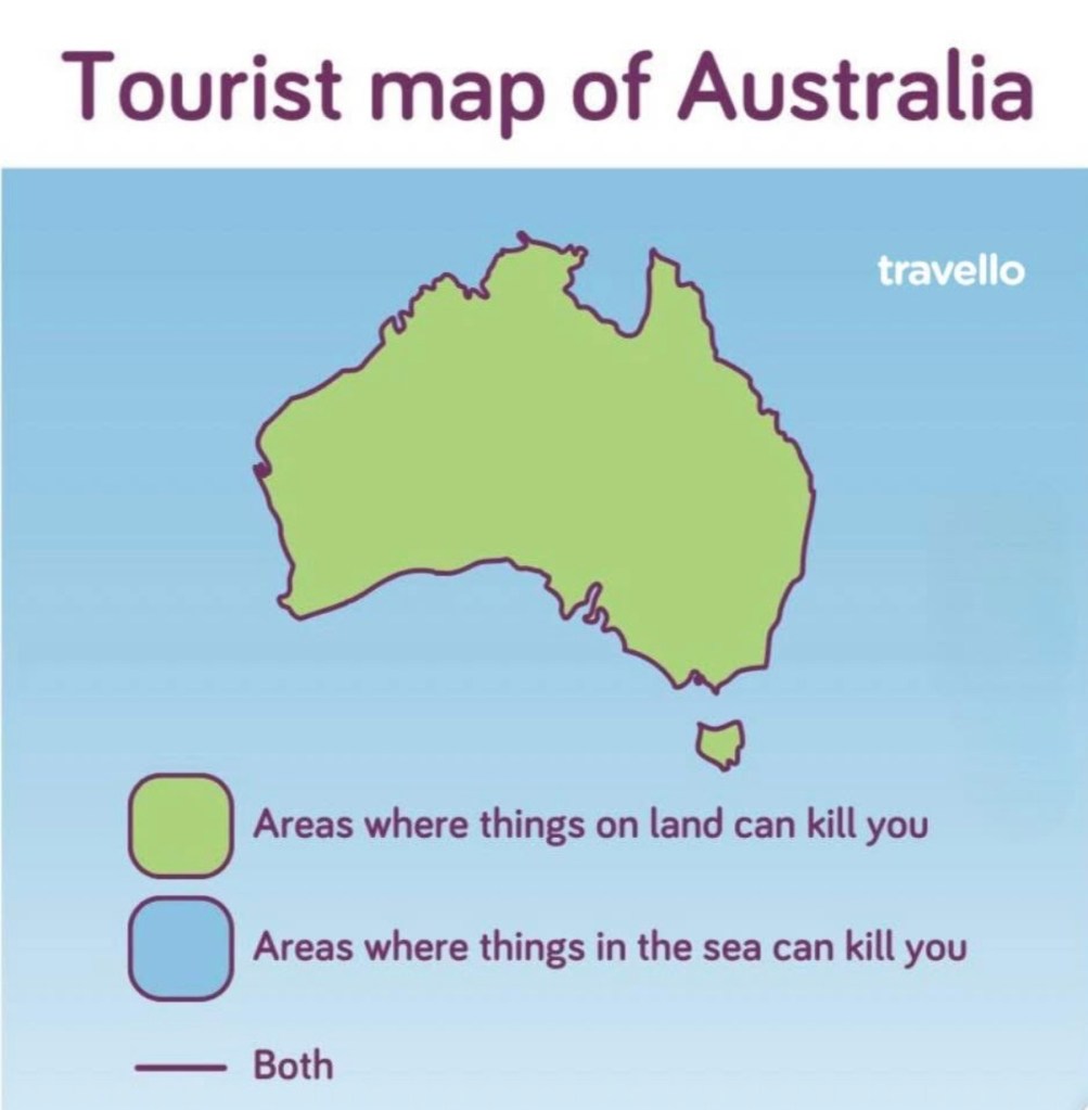To remember the various hazards that Australia poses to the unwary we found a helpful map that reveals the areas of risk (below).