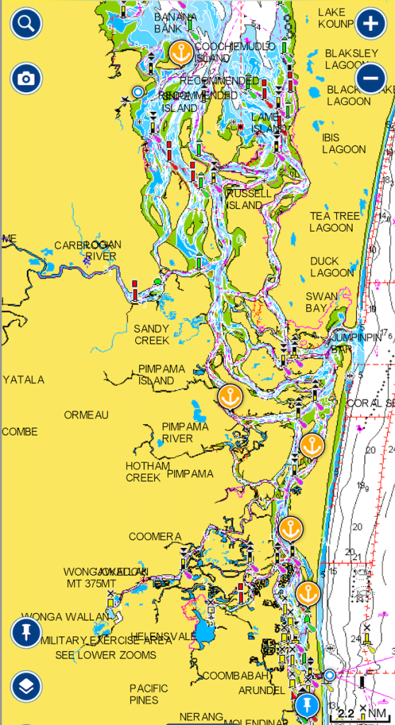 Next morning we bid adieu to ‘Coochie,’ as the locals call it, and headed south towards South Port. The image below shows the inland waterways we followed. The anchor symbols show our route, where we stopped or considered stopping along the way. Normally, these channels are quiet and serene, but over the holiday period they were busy, and the closer we got to the Gold Coast, the busier they got.