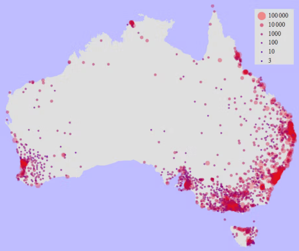 Australia is a big country, the sixth largest in the world, but despite this its population is one of the most urbanised in the world. The Crocodile Dundee type image of Australia is largely a fallacy. The vast majority of its 27 million people are squeezed into a narrow corridor between ocean and inhospitable interior. A full 90% of Australians live within fifty kilometres of the coast (a mere 0.22% of the country’s land mass): 73% in major cities, 26% in inner and outer regional areas, and only 2% in remote or very remote areas. The resulting density of people can be a little overwhelming, and the boom in building over the past few decades has resulted in parts of Australia becoming a seemingly endless vista of beaches, high-rises, and malls.