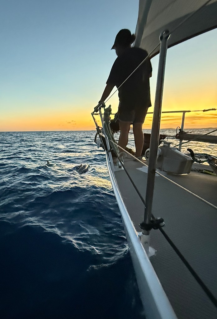 As if to distract us from the constant motion, a pod of dolphins arrived just before sunset and frolicked at the bow until dark.