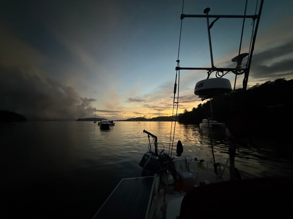 Before our departure we went over to the nearby beach and had a quick dip, staying in shallow water due to the threat of sharks. On our way back to the boat we stopped to talk to the owner of another yacht who was anchored just in front of us, and who, I feared, might be sitting above our anchor which would prevent us from raising it. I wanted to ask if he could drive forward to give us more room. The guy on-board apologised and told us he couldn’t move, explaining that he had no sails and that his gearbox had failed when trying to anchor the night before. He had basically anchored whilst being dragged sideways by the tide. We were lucky to have avoided a collision. Happily, a short while later the change of tide moved everyone around enough for us to lift the hook and we headed out of the river and across the bar.
