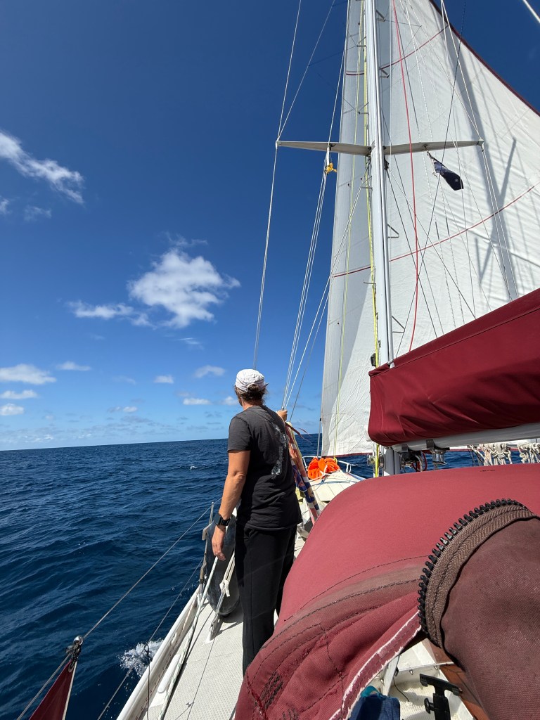 The wind increased as predicted and we tried various sail configurations to gain speed and reduce roll. For much of the time we had our mainsail raised in the third reef position to act as a dampener, and at one point tried a wing on wing approach, which worked well for a while.