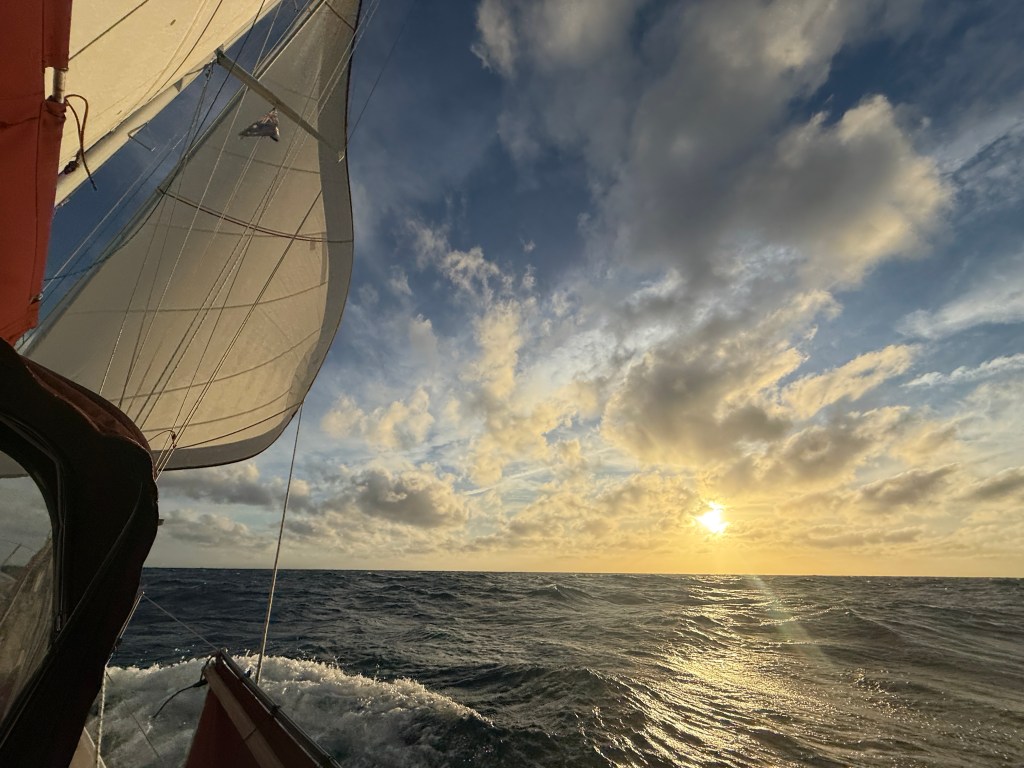 After an easy downwind sail we enjoyed watching the setting sun, and then settled down into our second night of three on, three off watch pattern. Starting at 9pm the night before meant that we were already feeling pretty tired. In the past we have found that it takes two or three days to get into the swing of a passage, so that shorter passages can feel like harder work than those that are twice as long.