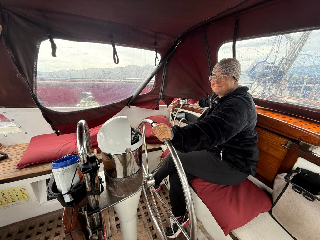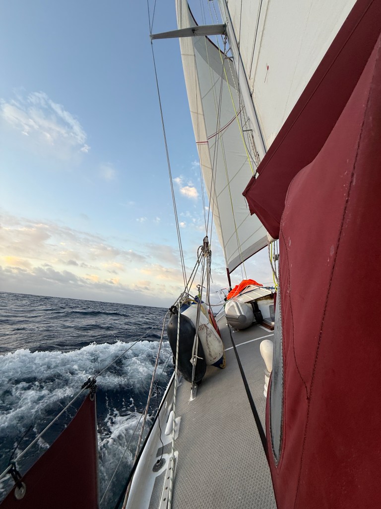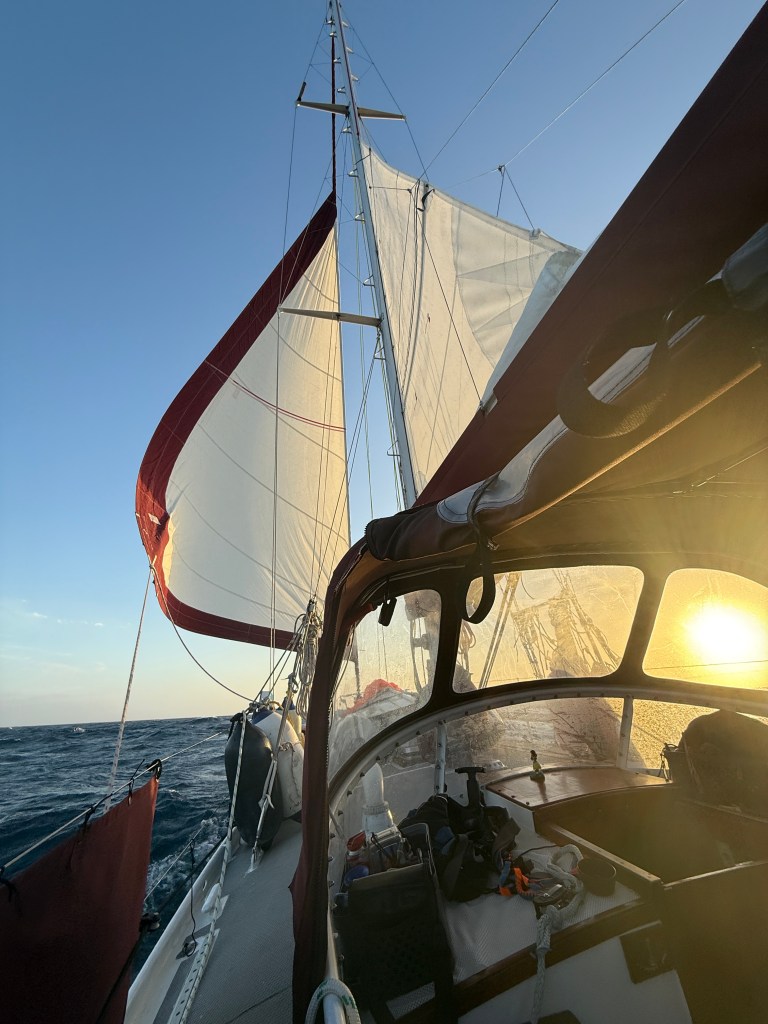 Eventually the northern wind began to blow and we were able to turn off the engine and raise our sails. The Hydrovane was tuned to our course, and successfully steered the boat 24/7 for the entire trip, using no power, eating no food, and making no complaints. As the day wore on the wind increased, and the forecast appeared to be bang on.