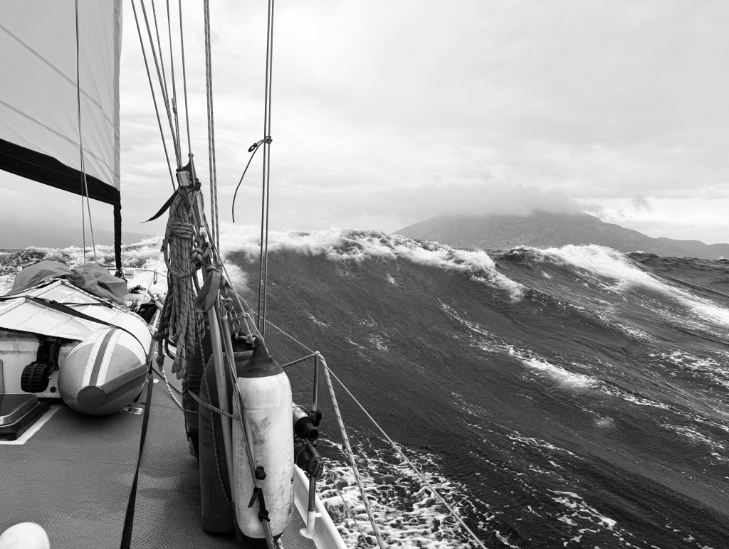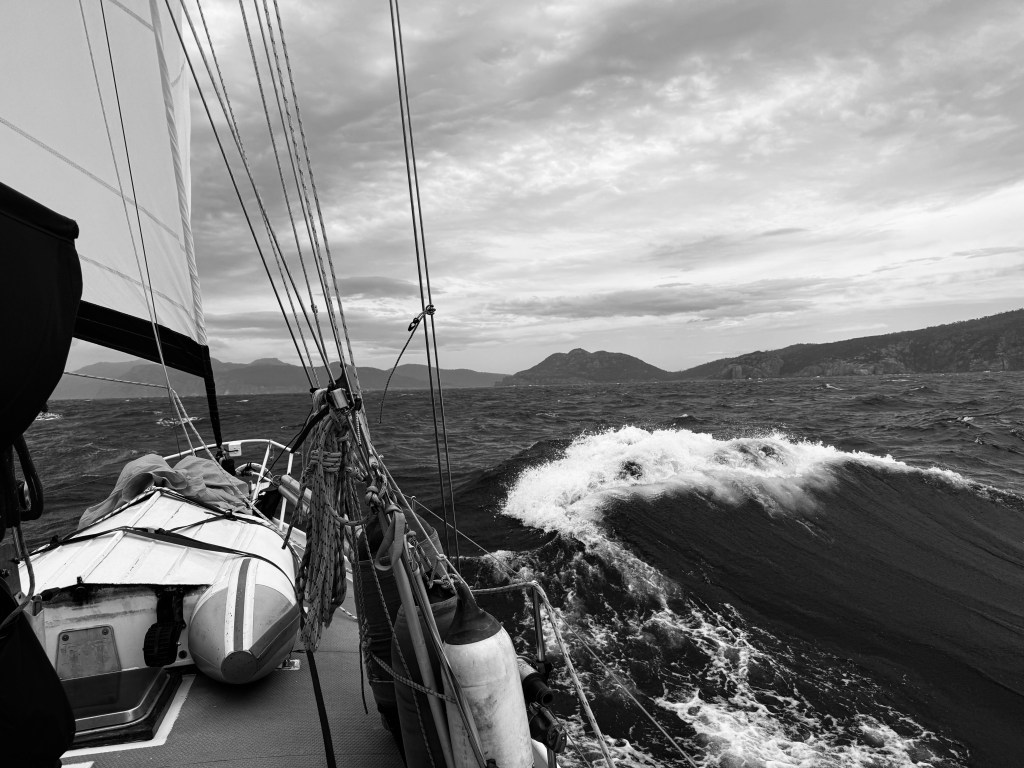 In the photo of the chart plotter above you can see Wineglass Bay (above and to the right of the wine glass tag). As you can tell from the previous photographs the waves were following almost our exact course, straight into Wineglass, and the wind speed captured here is 35 knots. For non-sailors, 15 knots is generally considered a nice breeze for sailing, 15-20 is the goldilocks spot — not too little, not too much. At double the wind speed, 30 knots, the power of the wind is quadrupled rather than doubled, so it’s getting a bit strong. At this point most yachts would be well reefed down (their sail areas reduced to de-power the boat). If we wanted or needed to retreat from Wineglass Bay we would have to beat into the wind (sailing at the closest angle to the wind that the boat can sail) which is slow, hard work, and almost impossible in any kind of rough sea state. Attacked head on the waves effectively stop or slow the boat so much that she flounders and has to be turned down wind. With land nearby the result can be disastrous.