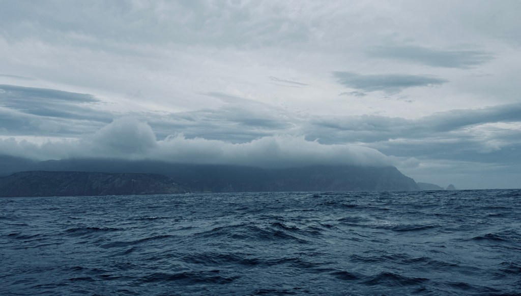 As we got closer to land we were rapidly approaching the point of no return. The temptation to get into shelter was pretty strong, we were both fatigued and the next anchorage was some hours away. However, we were both calculating the risks and I recall looking at Cara, Cara looking at me, and us simultaneously saying, ‘yeah, nah,’ or words to that effect. We jibed and headed back out to sea, following the line of cliffs at a safe distance.
