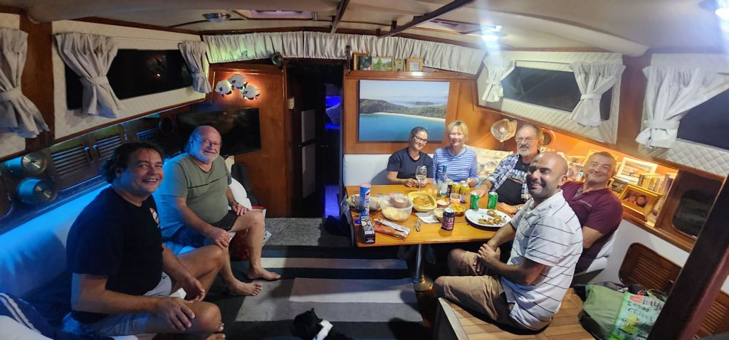 We were fortunate to be in the company of a friendly and social group of cruisers who were waiting for the appropriate weather to take them where they were going. In the photo below (from left to right) we have Thomas, a Swedish solo-sailor who had just returned from Tasmania and was heading north; Ian, a professional sailor being paid to take a catamaran to Adelaide; Cara; Dianne and Robin who are from Tasmania but were heading to Lakes Entrance for a survey in the hope of selling their monohull (they prefer their catamaran); me; and Azza, the new and proud owner of the catamaran that Ian was helping him to sail home. Not featured are Brad and Rae (whose boat we are on) who were returning to Perth from Indonesia. As you can imagine, there was a lot of wisdom in the room when it came to local weather conditions, and when to cross the strait. Thomas, emphasised the need for caution, telling us that his passage across the Bass Strait back to the mainland was one of the worst trips he had had in his semi-circumnavigation from Sweden. The main issue we faced was finding a window that lasted three days. The weather in Australia has been very, very changeable, often ‘boxing the compass,’ blowing from all directions, in a single day, and rarely blowing from the same direction (other than south) for more than a day or two.