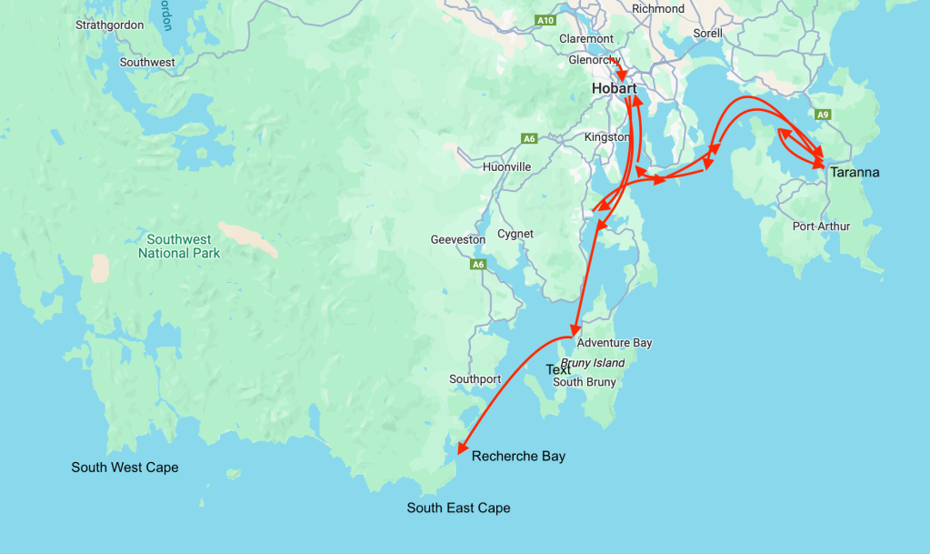 Our plan was to slowly sail back down the D’Entrecasteaux Channel to Recherche Bay, the closest all-weather anchorage for those planning to head to Port Davey. The sixty nautical mile trip from Recherche to Port Davey involves sailing west for roughly nine hours, ‘turning the corner’ (as they say in these parts) at the aptly named South West Cape, and then sailing north for another three hours or so. Unfortunately, westerly gales are the norm in the infamous ‘roaring forties.’ Indeed, those intrepid souls who race around the world use the strong prevailing winds in these latitudes to blast around the globe in the shortest possible time. We couldn’t leave until the weather decided to play ball, but we had to be ready for when it did.