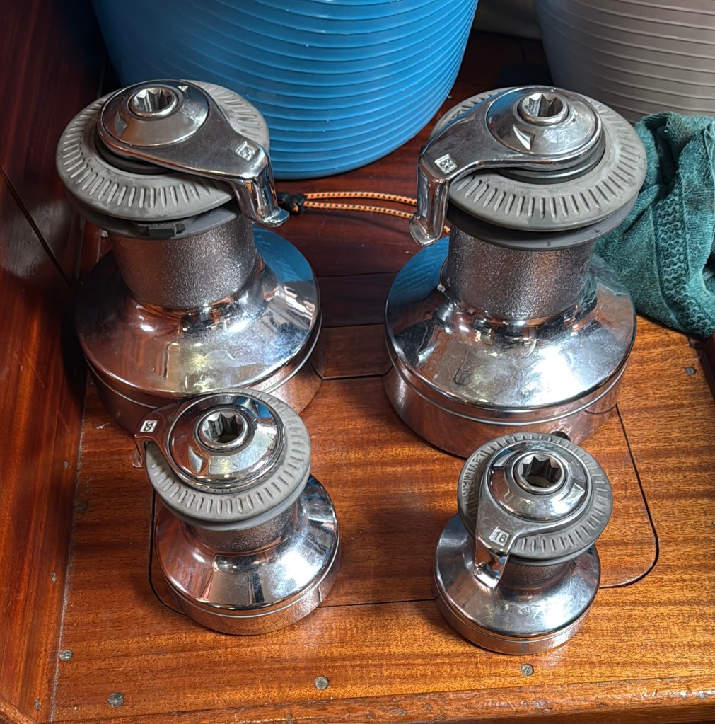 Other jobs we tackled included removing and rebedding the two deck hatches (as well as replacing their acrylic ‘glass’), rewiring the windlass, adding several new electronic goodies that allow us to better monitor boat systems, repairing the dodger, adding a solar arch (taken from Serida) renewing the antifoul, cutting and polishing the topsides of the hull, servicing the engine and (hopefully) fixing a minor, intermittent oil leak, and so on and so forth. We also had a local rigger check the rig after our brush with the local infrastructure. Happily it passed inspection and as an added bonus the chap suggested a different lay out for our inner fore stay. This will allow us to do away with our running back stays, a way of strengthening the middle of the mast when under storm jib (which pulls from mid-mast), but which prevent us tacking, jibing, or heaving to without removing them first, which isn’t always easy in a big sea. We’re still waiting on the new stay to arrive, but fingers crossed it works as promised. So, with everything going on at once it was a busy time. Our apartment quickly became a secondary workshop complete with varnish station and winch strip down area, and resembled a crappy chandlery full of second hand boat bits and a charming bouquet of thinners.
