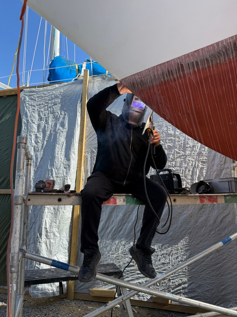 We also noticed another small area of corrosion in the bottom of the anchor locker (we were warned about this during our pre-purchase survey) so cut out that out too. It made sense to do the work whilst the anchor locker was accessible and we had access to Pete, a very experienced welder who charged a reasonable price, as well as all manner of paint suppliers, engineers, and so on. Within a few days, all the rust in the anchor locker was replaced with 6mm of brand new cortan steel, and I proceeded to smother it in epoxy paint. Naturally, the process wasn’t entirely straightforward, and weeks of gale force winds and squalls whistling straight down the Tamar River and into the exposed boat yard became a bit of a bore. On one memorable day the wind was blowing over forty knots and I turned up to find the three metre aluminium ladder that we used to get from ground level to the deck trying to take off. As it was tied on at the top (to prevent us falling backwards on the way up) it was flying up and down Taurus’ hull in the gusts. Apparently the weather was exceptional, everyone was sick of it, but finally the painting was done.