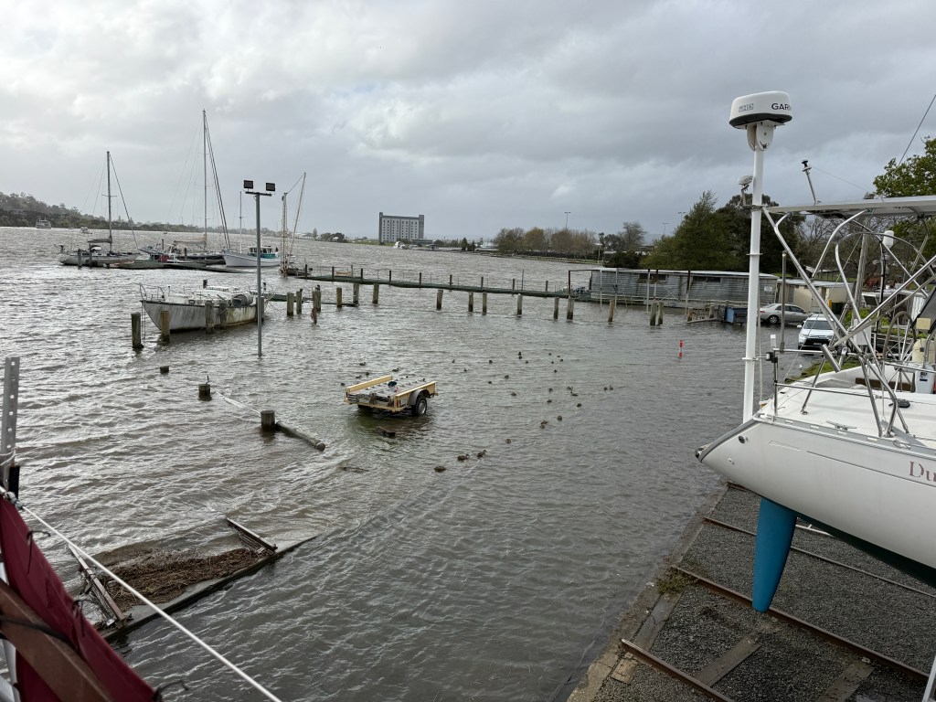 One of the more unusual aspects of the Tamar Yacht Club’s hard standing is its tendency to transform from land to lake. I was working in the shed on the pillar drill one evening when I realised my feet were getting wet. The tide was rising through the floor boards and kept going until it was several inches above the floor. Another evening I had to take off my shoes and socks to get to the car in the carpark which had become a large pond — complete with swans and ducks. After this experience I tried to remember to keep my gum boots handy!