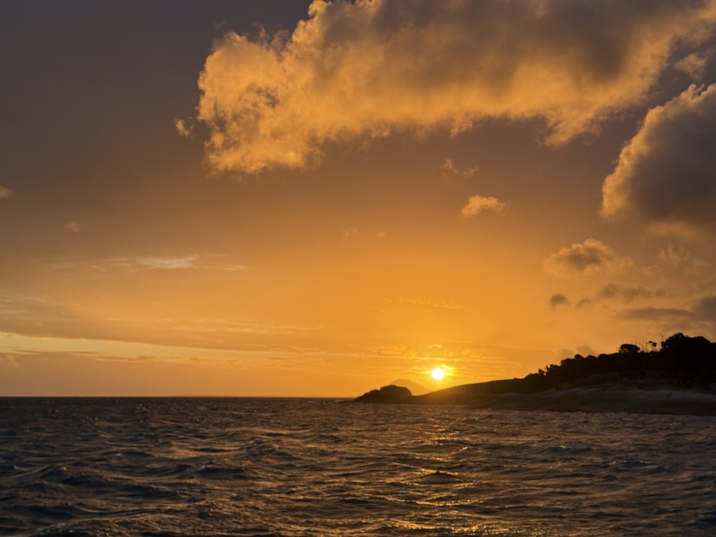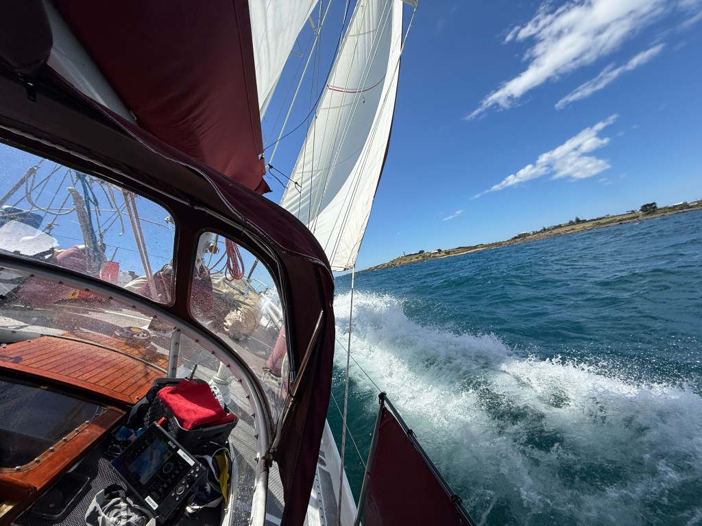 The sail to Flinders from Beauty Point takes about eighteen hours. The gusty NW wind meant that we enjoyed a beam reach (the wind coming from 90 degrees to our direction of sail) which allowed Taurus to fly along with comparative ease. The warm weather and effortless sailing was made even better when a large pod of dolphins joined us to play in our bow wave. As usual, everything else stopped so that we could enjoy the spectacle of these incredible animals. Suddenly the nerves were forgotten and it felt fantastic to be out sailing again.