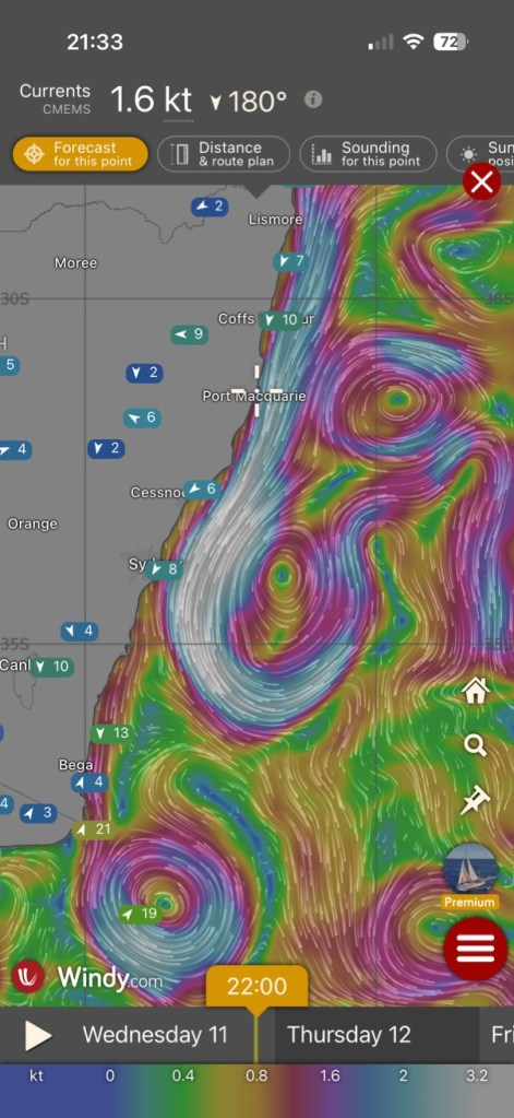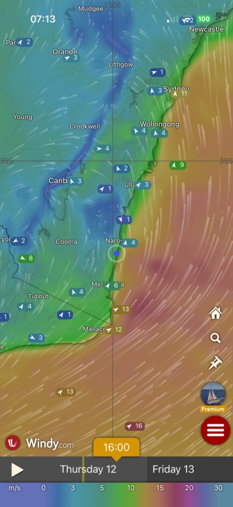 Another southerly was due that night, so we got ready to go and stayed up till 11:00 pm, but using a weather app we could see that the ‘real time’ gusts tracking north were far stronger than predicted, in the high 40s. When the wind reached us in Bermagui it struck with a roar, and we were getting over thirty knots in the marina, which is protected from the south. You’d have to add at least another ten knots to that in unprotected water, and no-one chooses to go sailing in forty knots. We went to bed.