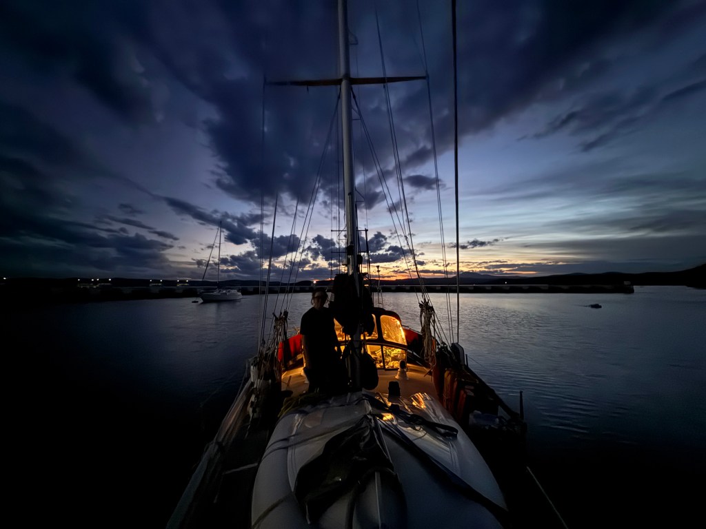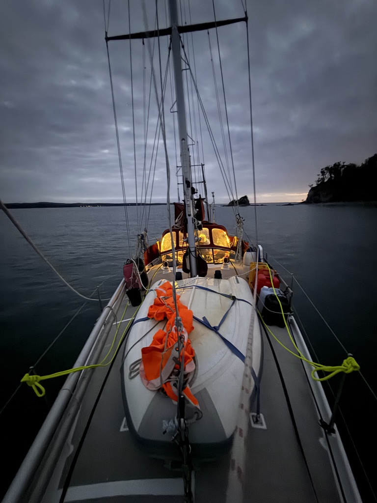 There was a possible weather window the next morning, a lightish southerly that we hoped would help us to get north. Wanting to leave early, we raised the dinghy and got everything ready for an early start.