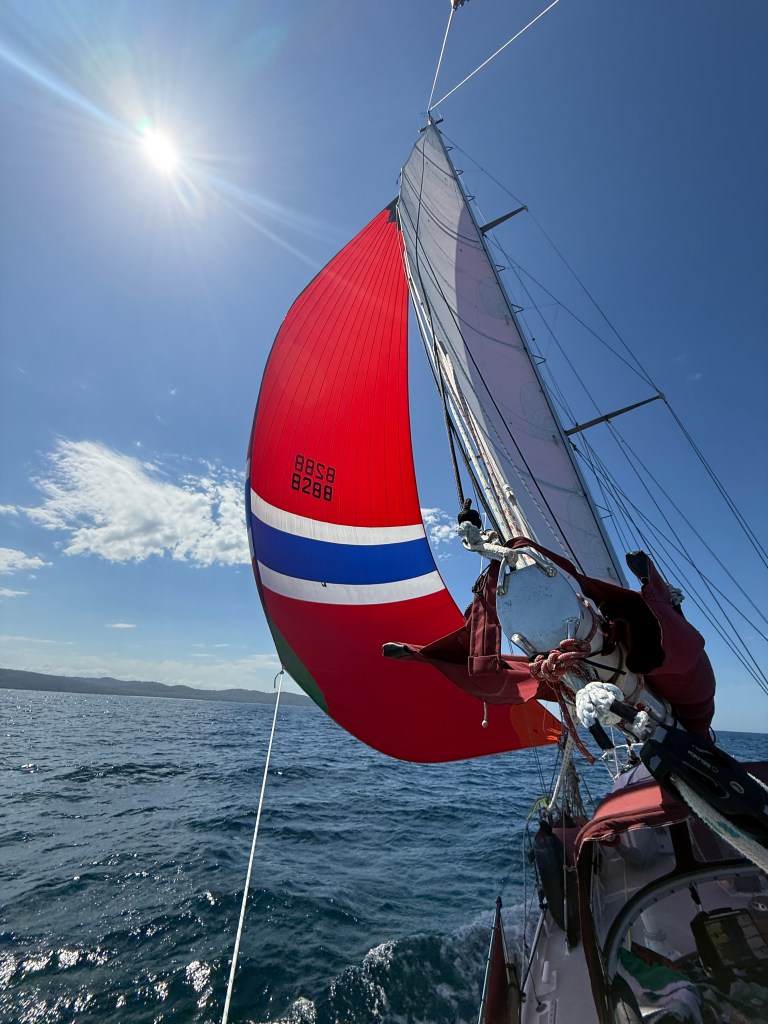 Of course, you never really know if a weather prediction is going to be spot on, or if the wind will be stronger, or weaker. We had hoped for stronger, but ended up with the other extreme. That coupled with a two knot current against us meant that we ended up motoring most of the following day. In the afternoon the wind started to lift, so we raised the spinnaker, more in hope than expectation, but without the engine’s assistance we were reduced to a crawling pace.