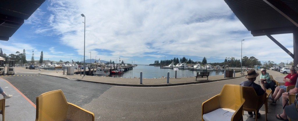 We had hoped to make Batemans Bay, but the going was desperately slow, and my back was still spasming periodically, so we decided to quit whilst behind, and bail into a closer port. Bermagui is a quiet Australian holiday destination, entered via what looks like it might be a bar, but which in fact isn’t. The river on the other side of the entrance is too shallow for a keeler to anchor, so we had no option but to pay for a marina berth. At $80 a day, the cost of a four day stay would cover us for nigh on a month in Tasmania — there was no doubt that we were back on the Aussie mainland.