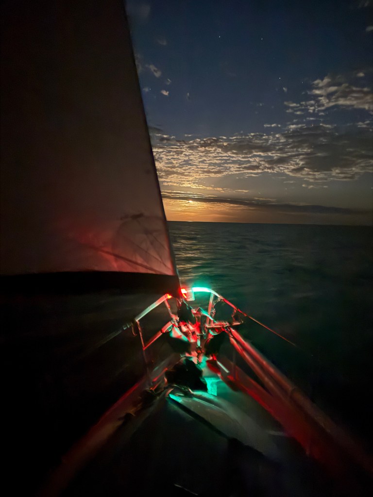 At about two in the morning, with our speed regularly dropping to around one and a half knots, I caved in to temptation and turned the engine on. Motor sailing allowed us to attain something more like a respectable speed; but I don’t like to motor sail, or indeed motor if I can help it. First and foremost, Taurus is a yacht, she’s built to sail; second, diesel costs money (though not a lot, we use about 3-4 litres of diesel an hour); third, motoring is noisy; and, lastly, motor sailing is bad for our gearbox. We were told by a very experienced mechanic in Launceston that motor sailing was probably what caused our friction plates to glaze and eventually fail — uneven and light power demand creating excess wear. So, with a view to prolonging the longevity of our gearbox, it being economically unfeasible to replace the clutch plates alone in this insane, throw away, era, we try not to motor sail.