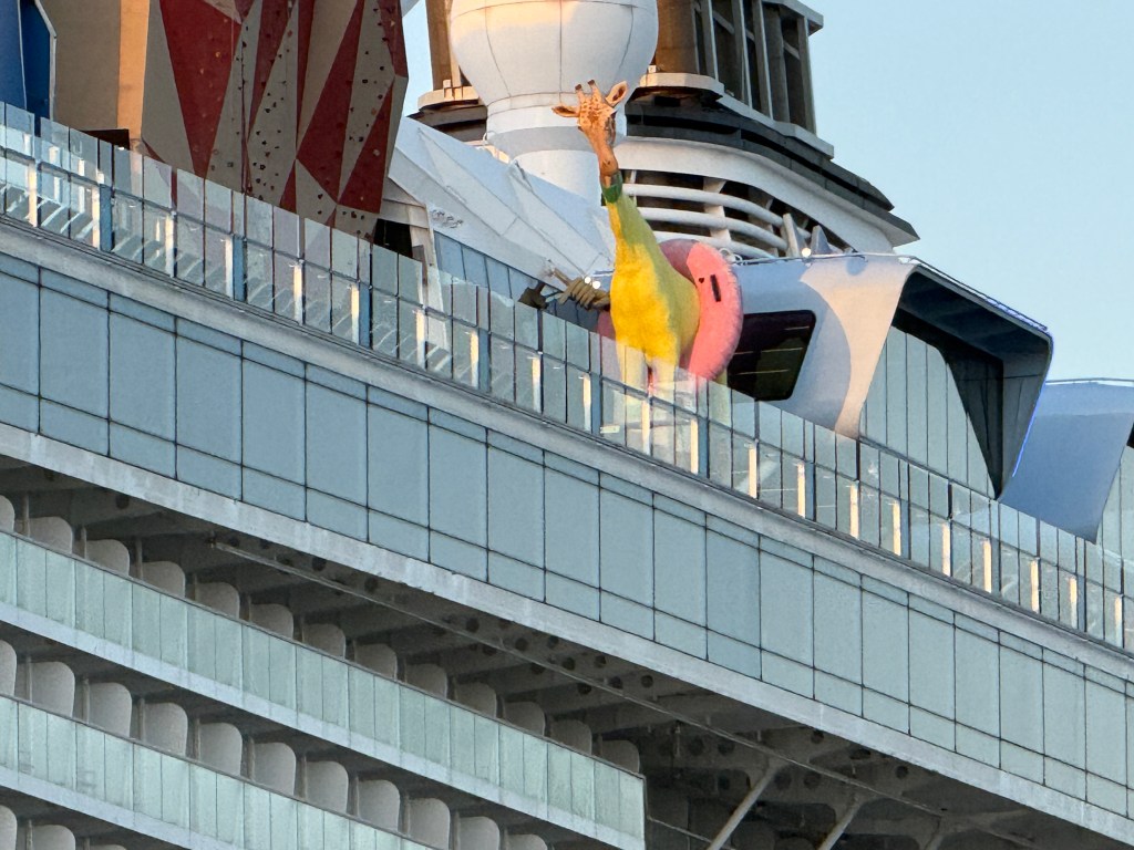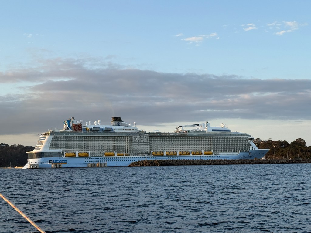 As we prepared to duck behind the sea wall that shelters the public mooring we kept an eye on the imposing cruise liner at berth, belching smoke into the air. We later learnt that the ship had broken down and desperate efforts were being made to fix her before the next liner was due to arrive. The only ‘passenger’ we could see didn’t look too phased, a giraffe with a swimming ring, on a Norwegian flagged vessel in Australia — what on earth is that about??