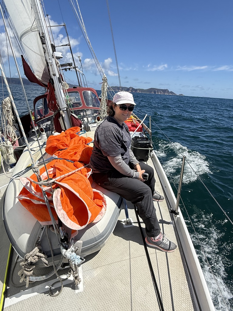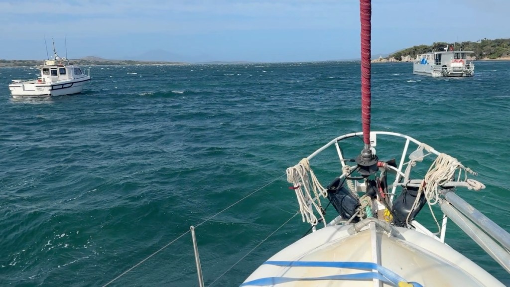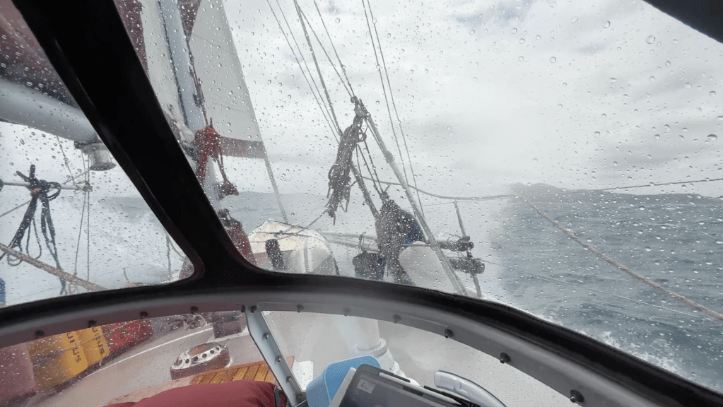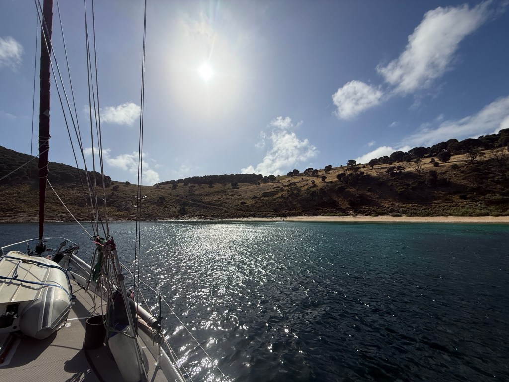 The sailing was pretty fast and comfortable, though dead down wind is always a rolly point of sail. As the day wore on the wind picked the waves up so that the rolling went from bad to worse, and at the end we had to hold on the whole time or risk being violently thrown across the cockpit as the boat rocked from one rail to the other every few seconds . In these conditions you can steer off the wind — which would have seen us heading towards land or out to sea; hoist the main to try and dampen the roll — which prevents wind reaching the jib sail, so it collapses and snaps full, over and over again, killing gear and fraying nerves; or you can endure it.