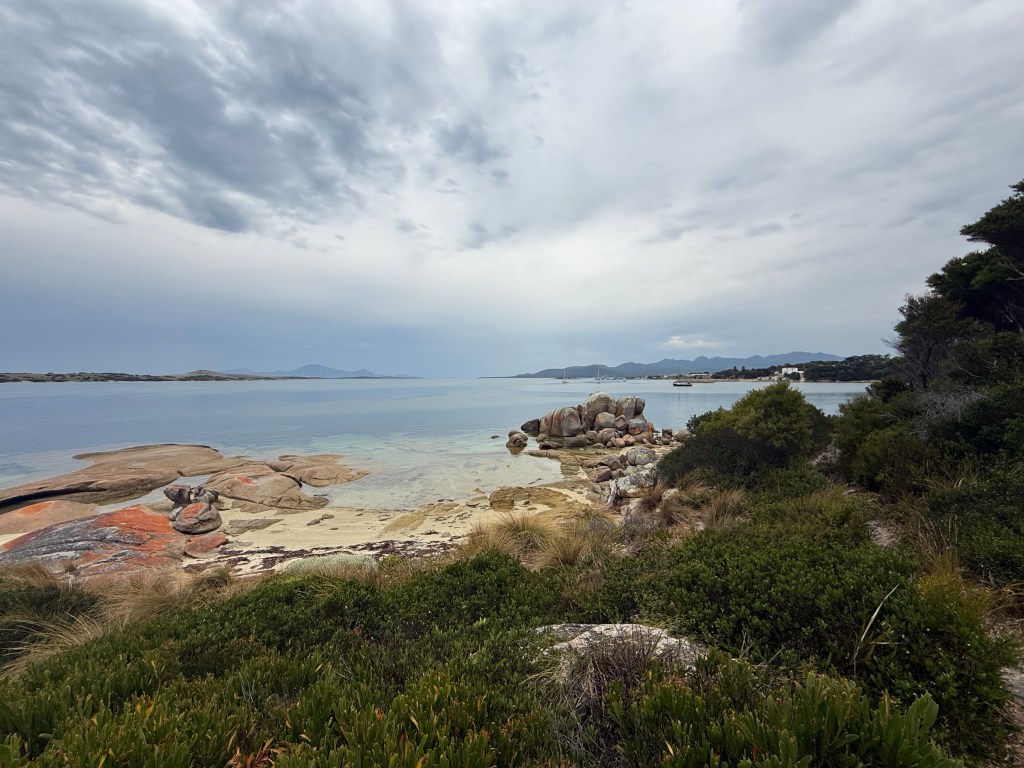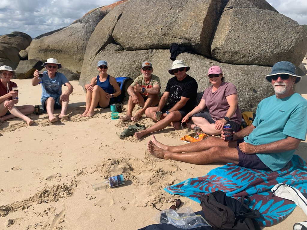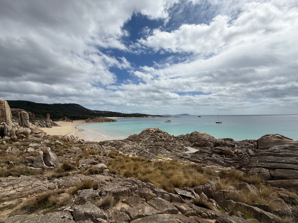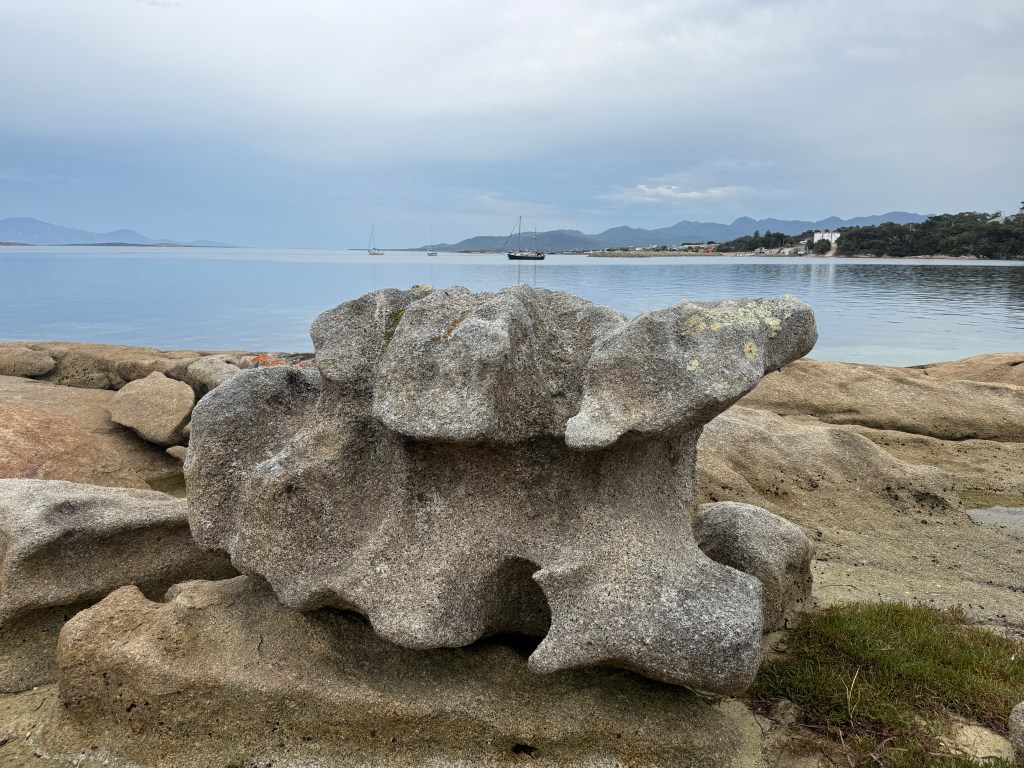 Strong winds were due the following day, so after returning to Taurus we headed back to Eden and a sheltered anchorage. To our delight another cruising couple had arrived whilst we had been away, Richard and Annette on Heather Anne, a steel sloop. This ex-Kiwi, currently Tasmanian couple were returning home from a sojourn to the Whitsundays, so we had a fantastic evening learning about their experiences with whales, tidal races, and Australian Army firing ranges. The next evening Annette invited us aboard for a roast lamb dinner, setting a new standard for on-board hospitality! Alas, the conversation flowed so well that we didn’t take a photo of this fascinating and generous couple until we were on our way back to Taurus. Thanks guys, we hope to meet again some day!