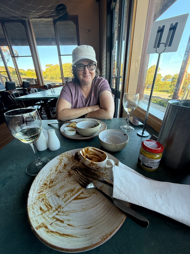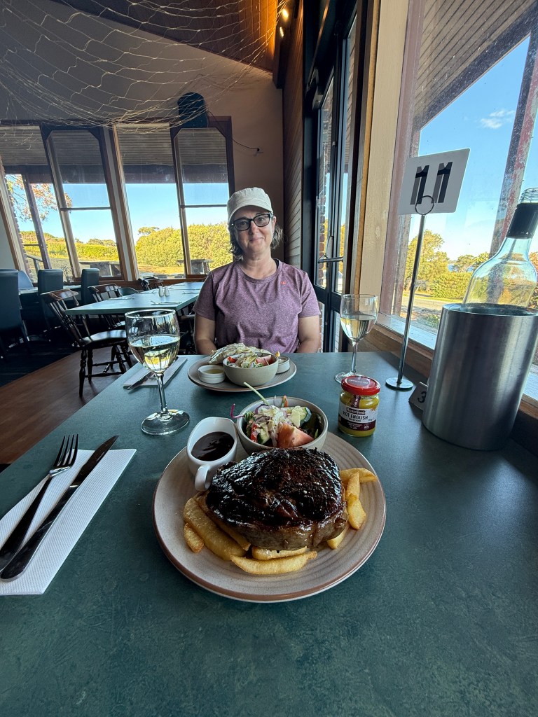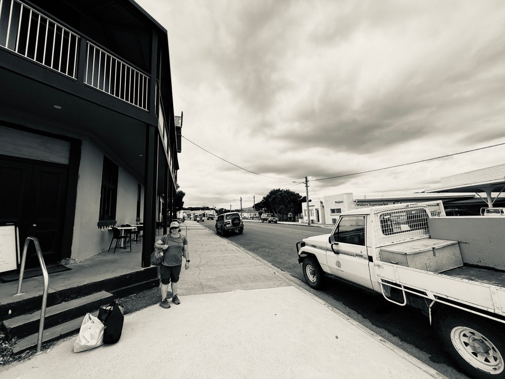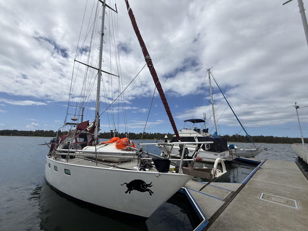 We had hoped to make Batemans Bay, but the going was desperately slow, and my back was still spasming periodically, so we decided to quit whilst behind, and bail into a closer port. Bermagui is a quiet Australian holiday destination, entered via what looks like it might be a bar, but which in fact isn’t. The river on the other side of the entrance is too shallow for a keeler to anchor, so we had no option but to pay for a marina berth. At $80 a day, the cost of a four day stay would cover us for nigh on a month in Tasmania — there was no doubt that we were back on the Aussie mainland.