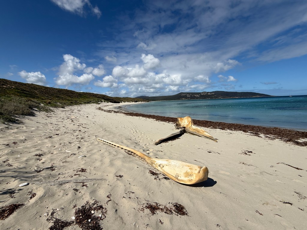 We had of course seen the Eden sites on our trip south a year ago, so after a quick wander about town and a fast food fix, we packed up to visit the southern end of the bay. As we arrived we were fortunate to be joined by yet more dolphins, who wanted to play in our bow wave.